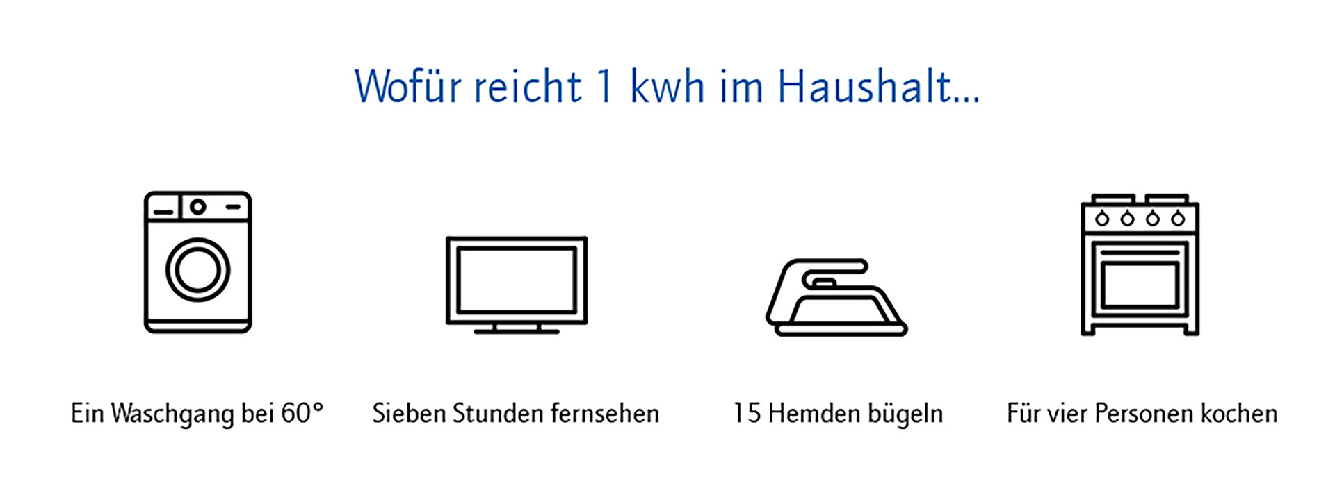 Der Verbrauch von Strom wird in Kilowattstunden (kWh) gerechnet. Eine kWh ist die Energie, die ein Gerät mit einer Leistung von einem Kilowatt (= 1.000 Watt) in einer Stunde verbraucht oder produziert. Beispiele: Ein Fön mit 2.000 Watt verbraucht in einer Stunde 2.000 Wattstunden, also 2 kWh. Eine 20-Watt-Energiesparlampe setzt bei einer Leuchtdauer von einer Stunde 20 Wattstunden, also 0,02 Kilowattstunden um.
